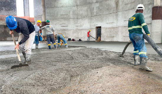 Ao final da concretagem completa, cerca de 350 toneladas de concreto terão sido utilizadas para finalizar os 128 metros cúbicos do piso.